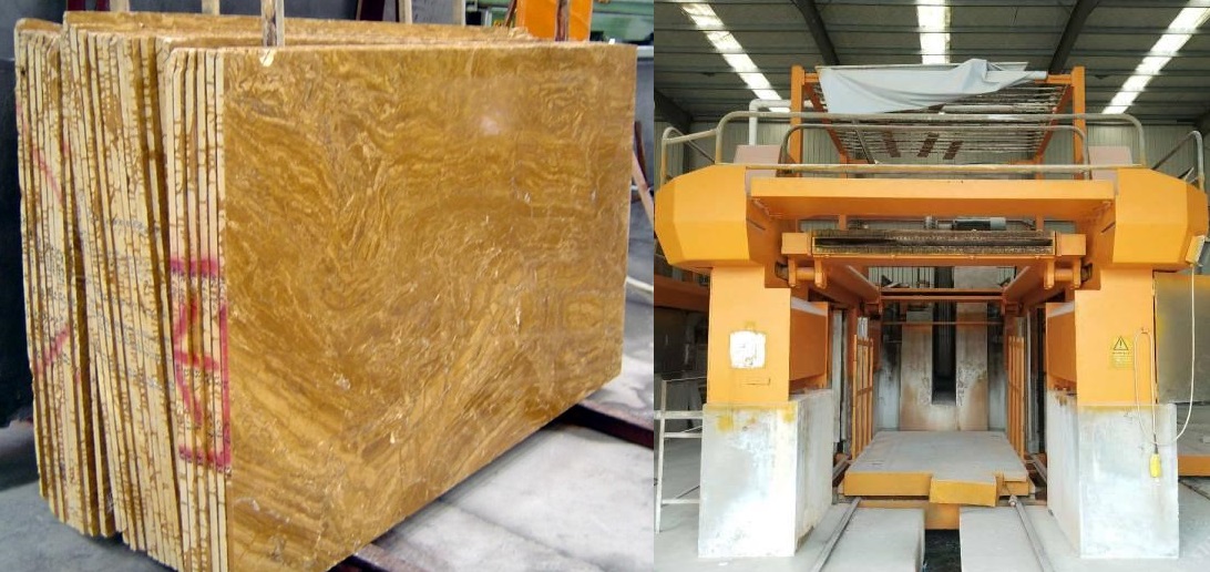 排鋸是將一組(幾十到上百根不等)排鋸裝在往復式鋸框上,由通過電機帶動大飛輪上的曲柄連桿機構(gòu)驅(qū)動鋸框做往復運動,同時通過升降傳動機構(gòu)連續(xù)向下作進給運動對鋸片施壓,使金鋼石鋸片對石材做相對的切割運動,達到切割石材的目的。鋸框往復運動速度最高可達92m/min,主運動導軌采用高鋼性設(shè)計,導向精度高,鋸縫小,因此是目前排鋸主流產(chǎn)品設(shè)計的標準。