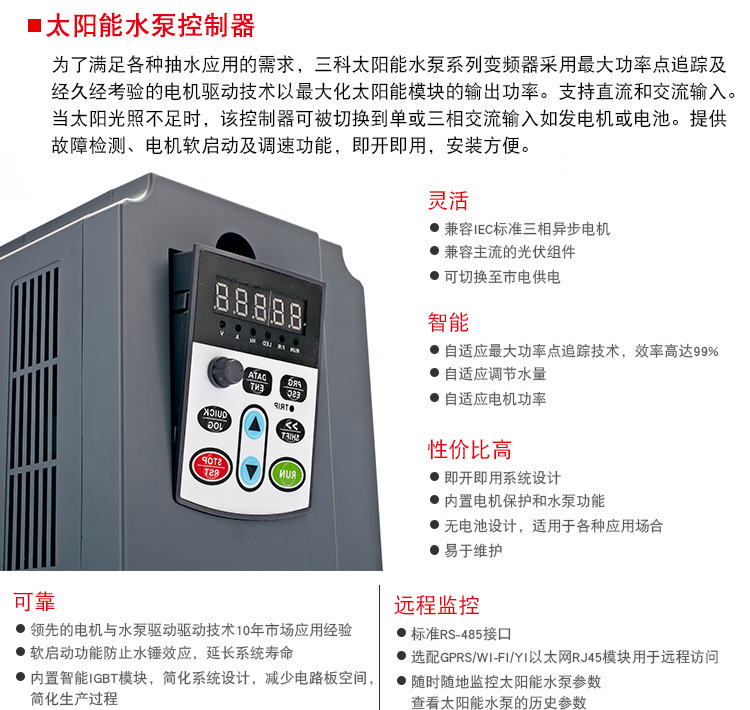 SK650系列變頻器是三科推出的針對(duì)光伏發(fā)電,驅(qū)動(dòng)三相交流水泵的變頻器,它采用大功率點(diǎn)追蹤及久經(jīng)考驗(yàn)的電機(jī)驅(qū)動(dòng)技術(shù)以催化增大太陽(yáng)能模塊的輸出功率,它將直流電直接逆變成三相交流電,可驅(qū)動(dòng)各類交流水泵。同時(shí)它支持直流和交流輸入,當(dāng)沒有太陽(yáng)能時(shí),該變頻器手動(dòng)切換到單項(xiàng)或三相交流電輸入,如市電發(fā)電機(jī)或電池。SK650光伏水泵變頻器提供全方位保護(hù),電機(jī)軟啟動(dòng)及調(diào)速功能,即開即用,安裝方便。