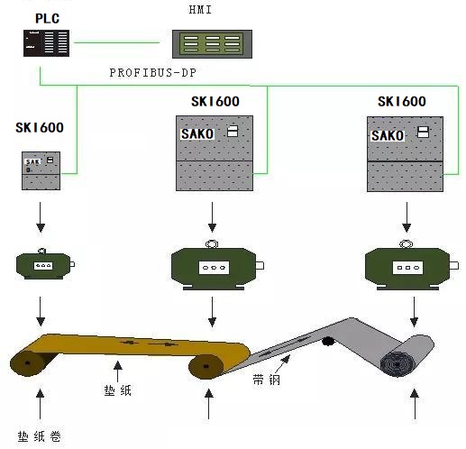 HMI作為操作工藝參數(shù)的輸入部分,是人機(jī)交互界面,通過輸入不同的參數(shù)來實(shí)現(xiàn)不同鋼材卷取要求。PLC作為控制器進(jìn)行運(yùn)算控制,協(xié)調(diào)各個(gè)變頻器工作。為了滿足高速響應(yīng)性,系統(tǒng)采用PLC和以及三科SKI600進(jìn)行PROFIBUS-DP協(xié)議通信
