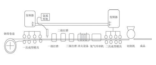 半成品不銹鋼帶整卷放置在放卷機架上面(被動放卷),在1#變頻器驅(qū)動下,鋼帶通過一次成型模具(多個模具)將鋼帶逐級卷成管狀,通過下一個環(huán)節(jié)---氬弧焊接設(shè)備對著閉合口進行連續(xù)不斷的焊接。然后進入三級加濕打磨將焊接點打磨光潔無痕。淬火使不銹鋼材質(zhì)變得更加適應(yīng)各種惡劣場合。又通過第二次成型還可對成品直徑進行校正,保證產(chǎn)品的合格率。最后根據(jù)要求將不銹鋼管通過切割成不等長度的成品。