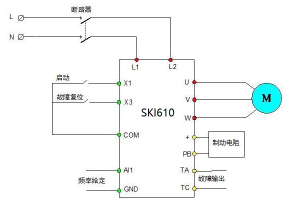 在客戶要求減速時間較短的場合,可根據(jù)需要選配接制動電阻,接入主回路端子的P+/PB之間。制動電阻功率可參考說明書附錄部分的機器功率等級選擇相匹配的型號。