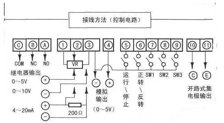 2、由于控制電路的頻率輸入信號(hào)是微小電流,所以在接點(diǎn)輸入的場(chǎng)合,為了防止接觸不良,微小信號(hào)接點(diǎn)應(yīng)使用兩個(gè)并聯(lián)的節(jié)點(diǎn)或使用雙生接點(diǎn)。
