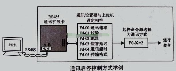 在VFD多功能擴展口上,插入相應(yīng)的通信接口卡,選擇控制命令源作為通信模式(F0-02=2),這樣就可以通過通信模式控制VFD的啟動和停止。通信相關(guān)功能代碼的設(shè)置如下圖所示。
