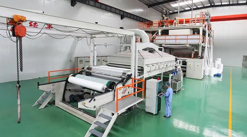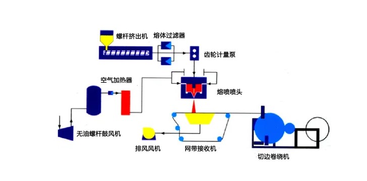 首先將無(wú)紡布的原料高分子聚丙烯放入螺桿擠出機(jī)中加熱熔融,將熔融的聚丙烯輸送到過(guò)濾器中過(guò)濾雜質(zhì),然后將熔體通過(guò)計(jì)量泵定量輸送到噴絲板組件中。此時(shí)噴絲孔兩側(cè)的熱空氣會(huì)以接近音速的速度吹動(dòng)流動(dòng)的熔體,使其迅速變細(xì),并在下落過(guò)程中被兩側(cè)的牽引空氣冷卻凝固成超細(xì)纖維,最后凝聚在一個(gè)輥筒上。通過(guò)自粘合成布,這樣生產(chǎn)出來(lái)的布不是用紗線(xiàn)織成網(wǎng),而是直接省略了加工成線(xiàn)的步驟,纖維粘合成布,所以稱(chēng)為無(wú)紡布。在從噴絲板擠出熔體的過(guò)程中,主要的電機(jī)設(shè)備是單螺桿擠出機(jī)。