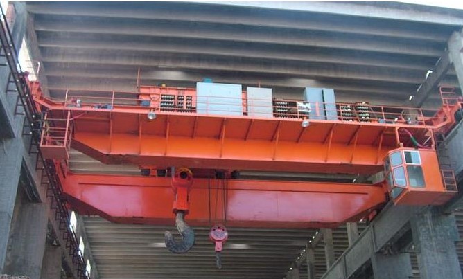 橋式起重機(jī)我們通常將其簡(jiǎn)稱為行車或天車,這是一種將橋架在高架軌道上運(yùn)行的橋架型起重機(jī)。其運(yùn)行的原理是通過橋架沿鋪設(shè)在兩側(cè)高架上,然后以軌道縱向運(yùn)行的方式工作,而當(dāng)起重小車沿鋪設(shè)在橋架上的軌道橫向運(yùn)行時(shí),則構(gòu)成一個(gè)矩形的工作范圍,這樣就可以充分利用的橋架下方空間來吊運(yùn)物料,可以有效避免地面設(shè)備造成阻礙和干擾。目前橋式起重機(jī)已廣泛的應(yīng)用在室內(nèi)外的倉庫、廠房、碼頭和露天貯料場(chǎng)等處中。橋式起重機(jī)通常是由起重小車、橋架運(yùn)行機(jī)構(gòu)、橋架金屬結(jié)構(gòu)組成。其中起重小車部分又由起升機(jī)構(gòu)、小車運(yùn)行機(jī)構(gòu)和小車架三部分組成。