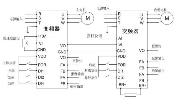 3、多組繼電器輸出。拉絲主機變頻器繼電器( FB.FC)為斷線故障報警輸出,繼電器(KA,KB)為系統(tǒng)減速停車時低頻抱閘輸出,實現(xiàn)卷取電機低速制動。卷取電機變頻器繼電器( FB,F(xiàn)C)為斷線故障報警輸出,繼電器(KA,KB)為排線電機啟停回路。使控制線路設(shè)計簡單方便,保證因發(fā)生異常導(dǎo)致的停車的運行系統(tǒng)的安全性殛延續(xù)性。