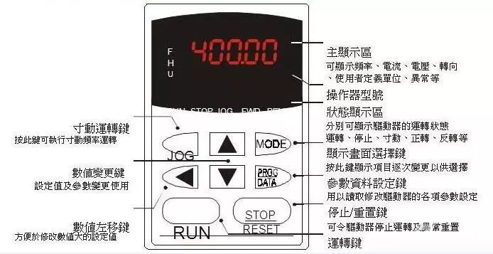 一般的變頻器都有運(yùn)行(RUN)、停止(STOP)、編程(PROG)、數(shù)據(jù)/確認(rèn)(DATA/ENTER)、增加(UP、▲)、減少(DOWN、▼)等6個(gè)鍵,不同變頻器操作鍵的定義基本都是相同的。此外有的變頻器還有監(jiān)視(MONTTOR/DISPLAY)、復(fù)位(RESET)、寸動(dòng)(JOG)、移位(SHIFT)等功能鍵。