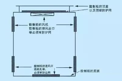 (3) 如果采用控制柜頂部側(cè)面排風(fēng)方式,出風(fēng)口必須安裝防護(hù)網(wǎng)。