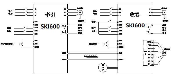吹膜機(jī)主要由吹膜和收卷兩部分組成,是一種將塑料粒子加熱融化并吹成薄膜的設(shè)備。其中收卷部分的作用是將吹制出的薄膜卷取成卷,并使成卷的薄膜平整無皺紋,卷邊整齊,卷軸上的薄膜要松緊適中,以防止薄膜拉伸變形,保證質(zhì)量,因此收卷時(shí)必須采用恒張力控制。目前行業(yè)內(nèi)主要使用力矩電機(jī)來實(shí)現(xiàn)上述控制,但在使用過程中存在著需手動(dòng)調(diào)節(jié),操作不方便,長(zhǎng)時(shí)間運(yùn)行時(shí)力矩電機(jī)發(fā)熱較高,其控制器較易損壞,可靠性不高的缺點(diǎn)。本文擬結(jié)合三科SKI600變頻器,介紹一種針對(duì)吹膜機(jī)收卷的恒張力控制系統(tǒng),在保證收卷工藝的同時(shí)可顯著提高設(shè)備的操作簡(jiǎn)易性和可靠性。