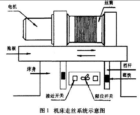 高速線切割機(jī)走絲機(jī)構(gòu)是影響其加工質(zhì)量和加工穩(wěn)定性的關(guān)鍵部件。送絲機(jī)構(gòu)的作用是驅(qū)動電極絲以一定的線速度前后移動,將電極絲整齊地排列在儲線筒上。儲線筒本身的高速正反轉(zhuǎn)是通過電機(jī)的正反轉(zhuǎn)來實(shí)現(xiàn)的。電機(jī)通過聯(lián)軸器帶動螺桿筒,再通過同步帶帶動螺桿轉(zhuǎn)動,使滑架往復(fù)運(yùn)動,通過調(diào)節(jié)換向左右保險(xiǎn)杠之間的距離,即可實(shí)現(xiàn)滑架的移動行程。機(jī)床的送絲機(jī)構(gòu)如下所示。