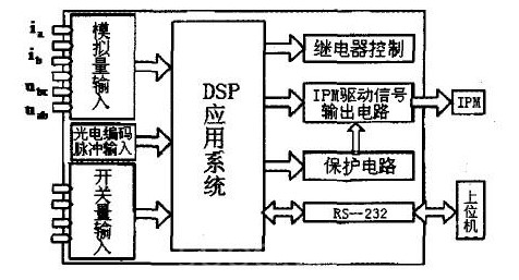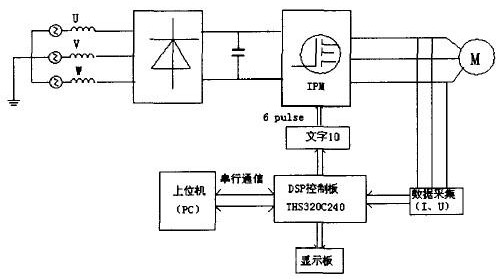 采用數(shù)字信號處理器作為控制器,可以減少外圍設(shè)備的數(shù)量,提高系統(tǒng)的穩(wěn)定性。在本設(shè)計(jì)中,主要使用了1MS32OC24Ox DSP的PWM輸出端口、板載A/D端口和捕獲接口CAP。DSP的六路PWM信號經(jīng)緩沖器反相后送到驅(qū)動電路板驅(qū)動IPM。控制系統(tǒng)結(jié)構(gòu)圖下所示。