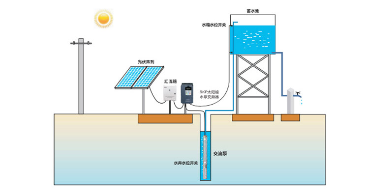 在當(dāng)前社會(huì)環(huán)境中,使用太陽能水泵系統(tǒng)的主要目標(biāo),是旨在為沒有電力供應(yīng)或電力短缺的偏遠(yuǎn)地區(qū)提優(yōu)質(zhì)節(jié)能的供水解決方案。該系統(tǒng)利用光伏陣列輸出的直流電來驅(qū)動(dòng)水泵抽水。該系統(tǒng)無需安裝電池,但可以將水儲(chǔ)存在儲(chǔ)水罐中以備后續(xù)使用。儲(chǔ)水的水源可以是河流、湖泊、地下水等天然水源,也可以是其他水源。