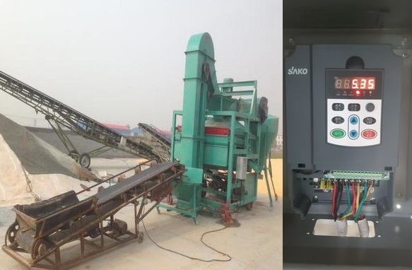 用工頻直接起動(dòng),電機(jī)能以最快速度到達(dá)工頻,篩體不容易產(chǎn)生機(jī)械碰撞甚至跳出軌道的情況。變頻器起動(dòng)要想達(dá)到接近直接起動(dòng)的效果,需要加速時(shí)間很短,這時(shí)起動(dòng)電流會(huì)增加,因此,變頻器選型時(shí)要注意,需要加大兩檔選型,這樣可以避免起動(dòng)過(guò)程中出現(xiàn)過(guò)電流報(bào)警的現(xiàn)象,同時(shí),也可以保證設(shè)備安全穩(wěn)定運(yùn)行。根據(jù)設(shè)備的使用情況,我們?yōu)槊颗_(tái)設(shè)備配套使用了一臺(tái)SKI600變頻器。