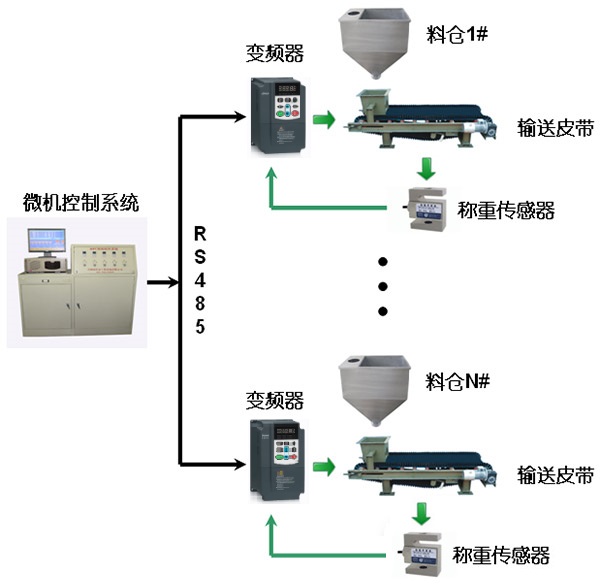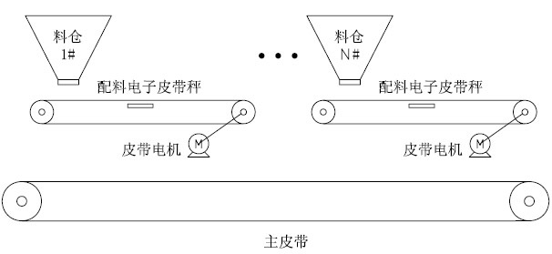 其主要工作流程是:料倉(cāng)打開(kāi)后,物料落入相應(yīng)的皮帶上,皮帶電機(jī)拖動(dòng)皮帶轉(zhuǎn)動(dòng),則物料被連續(xù)拉出,皮帶電機(jī)的轉(zhuǎn)速就決定了物料的流量。每個(gè)皮帶下面有一自動(dòng)稱重皮帶秤,通過(guò)皮帶秤就可以稱出下料的流量、累積量等數(shù)據(jù)。所有皮帶的下面是一輸送主皮帶,主要作用是把混合好的原料送到下級(jí)容器中。