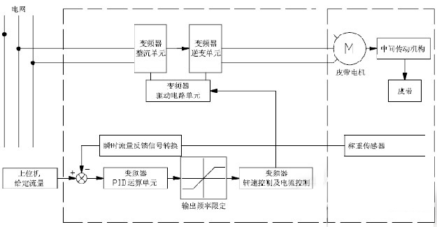 過(guò)流量設(shè)定及反饋,調(diào)節(jié)SKI600的輸出頻率以控制輸送皮帶的轉(zhuǎn)速,自動(dòng)實(shí)現(xiàn)給料流程的精確控制和給料總量的準(zhǔn)確計(jì)量。SKI600流量PID閉環(huán)調(diào)節(jié)結(jié)構(gòu)圖如圖3 所示。