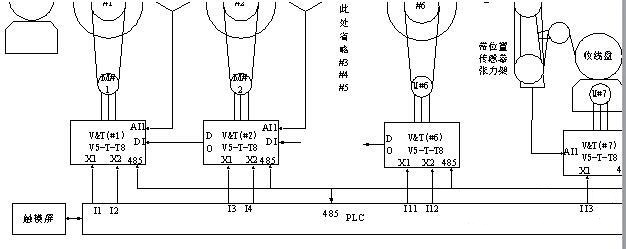 3、不銹鋼鍍鋅退火線拉絲機:金屬絲經(jīng)過酸洗、加熱、鍍鋅等工藝,從退火爐出來之后,經(jīng)過牽引輪,再經(jīng)過一積絲盤,最后收卷。要求VFD具有高精度的開環(huán)轉(zhuǎn)矩控制性能,并且,換盤時要有積絲和退積功能,保證在高速整機在高速運行進行換盤無沖擊、不斷線。系統(tǒng)接線圖: