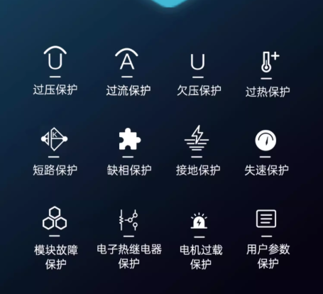 具備過壓、過流、欠壓、過熱、短路、缺相、接地、失速等全方位保護(hù)功能。