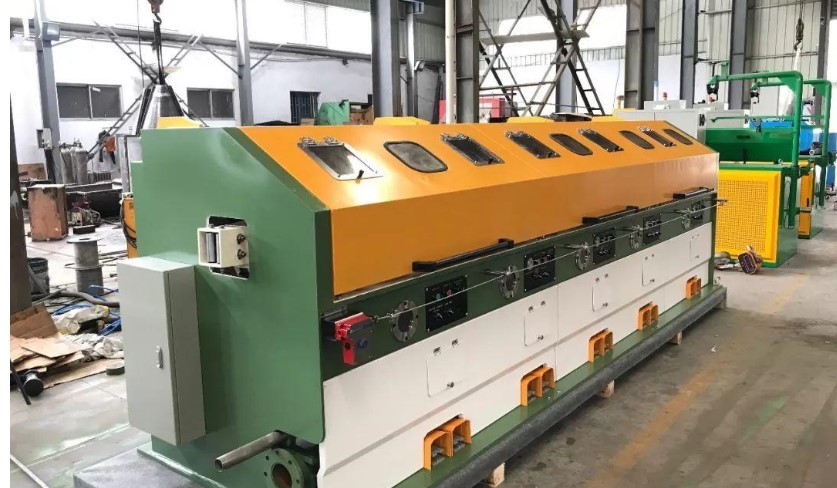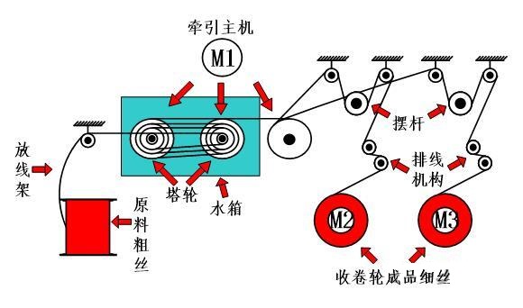 水箱式拉絲機是由多個拉拔頭組成的小型連續(xù)生產(chǎn)設備,通過逐級拉拔,并將拉拔頭置于水箱中,最后將鋼絲拉到所需的規(guī)格。就國內(nèi)幾個主要水箱式拉絲機生產(chǎn)商來看,一般配置了20個左右的拉拔頭。通過每一級的拉拔后,鋼絲的線徑發(fā)生了變化,所以每個拉拔頭工作線速度也應有變化。在整個拉拔過程中,只需要1臺電動機通過機械傳動或齒輪箱來驅(qū)動。根據(jù)拉模配置的不同,各個拉拔頭的拉拔速度也要變化。拉拔速度的基準是每個時刻通過拉模的鋼絲的秒流量體積不變,即要使下式成立
