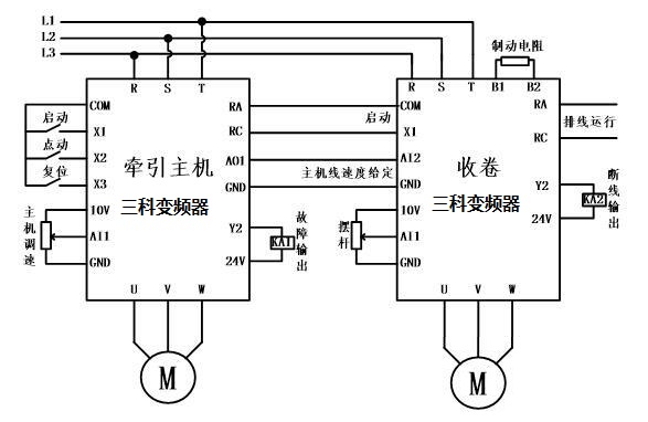 分別在牽引電機與收卷電機上應用4級、2.2~7.5KW中使用三臺變頻器
